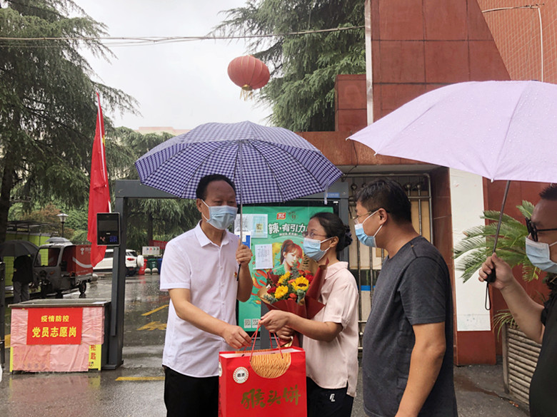 8月13日,南阳市疾控中心党委书记温毅明冒雨深入居民小区,走访慰问从郑州归来的抗疫英雄----崔士磊、何建磊、张澄、薛茜茜,给他们送上了鲜花以及水果等慰问品,对他们在疫情面前展现出的“为大家。舍小家”奉献精神深表敬意。