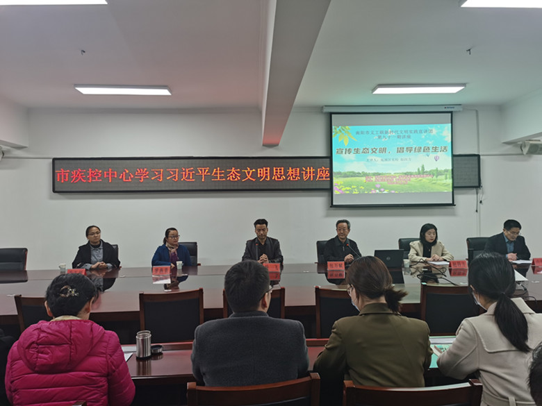 党的十八大以来,习近平生态文明思想深入人心,我国生态文明建设取得显著成效。为深入学习习近平生态文明思想,树立绿色发展理念,助力文明城市建设,11月1日下午,南阳市疾病预防控制中心特邀南阳市义务工作者联合会新时代文明实践公益宣讲团的赵四方老师来到中心,举办以“宣传生态文明 倡导绿色生活”为主题的习近平生态文明思想专题讲座。宣讲团团长包万赋、中心主任卢千超、副主任杨阳等领导出席并聆听了此次宣讲活动,中心各科室职工代表、文明专干参加学习活动。