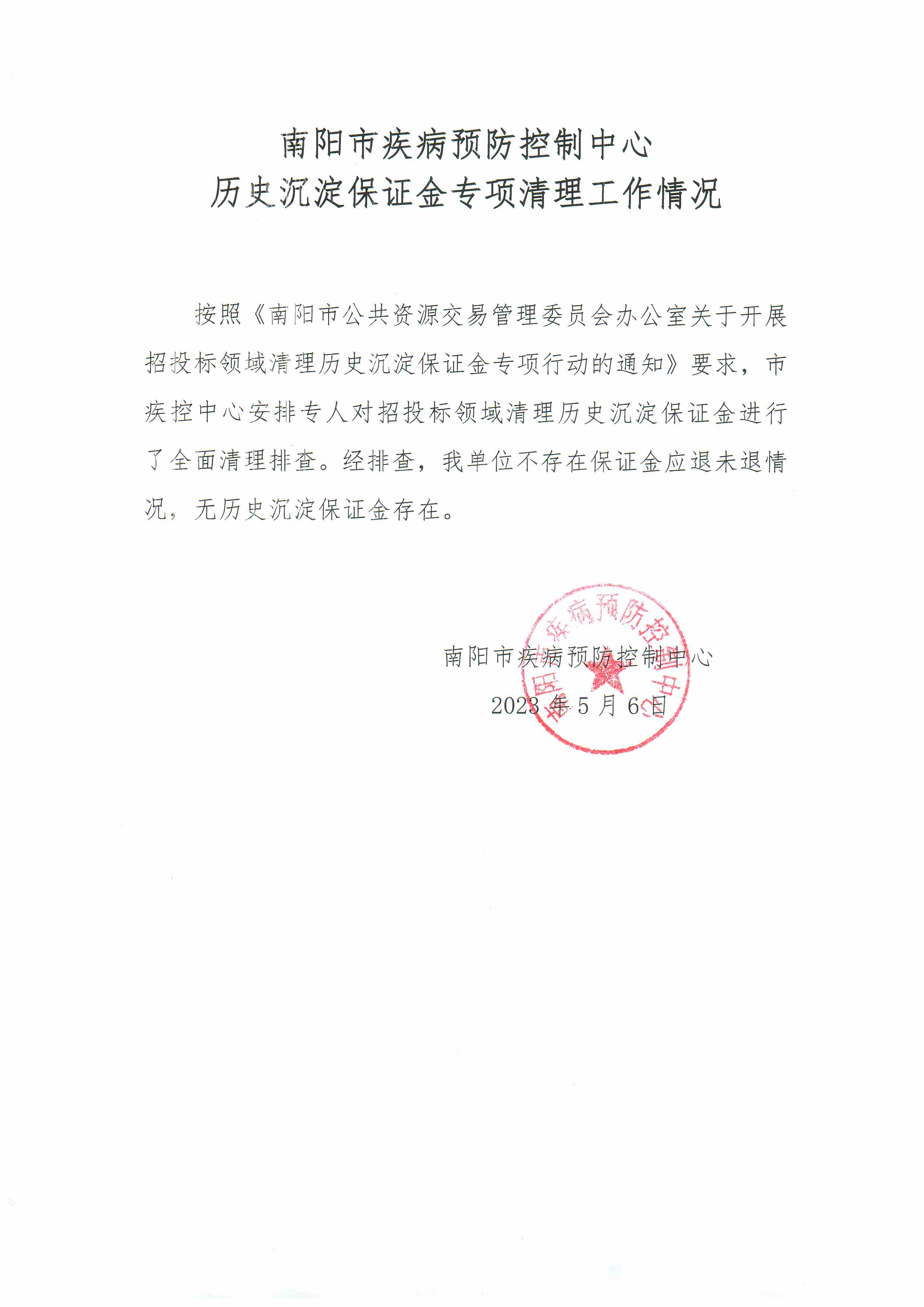 南阳市疾病预防控制中心历史沉淀保证金专项清理工作情况
